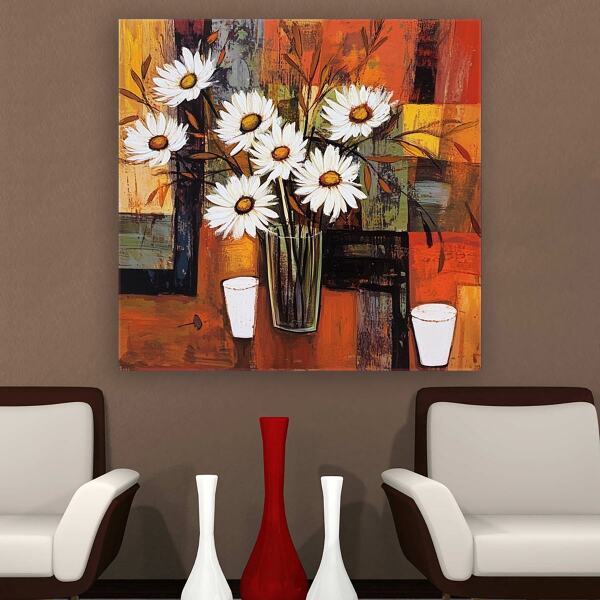 Abstre Desenler Üzerine Beyaz Papatyalar Kanvas Tablo